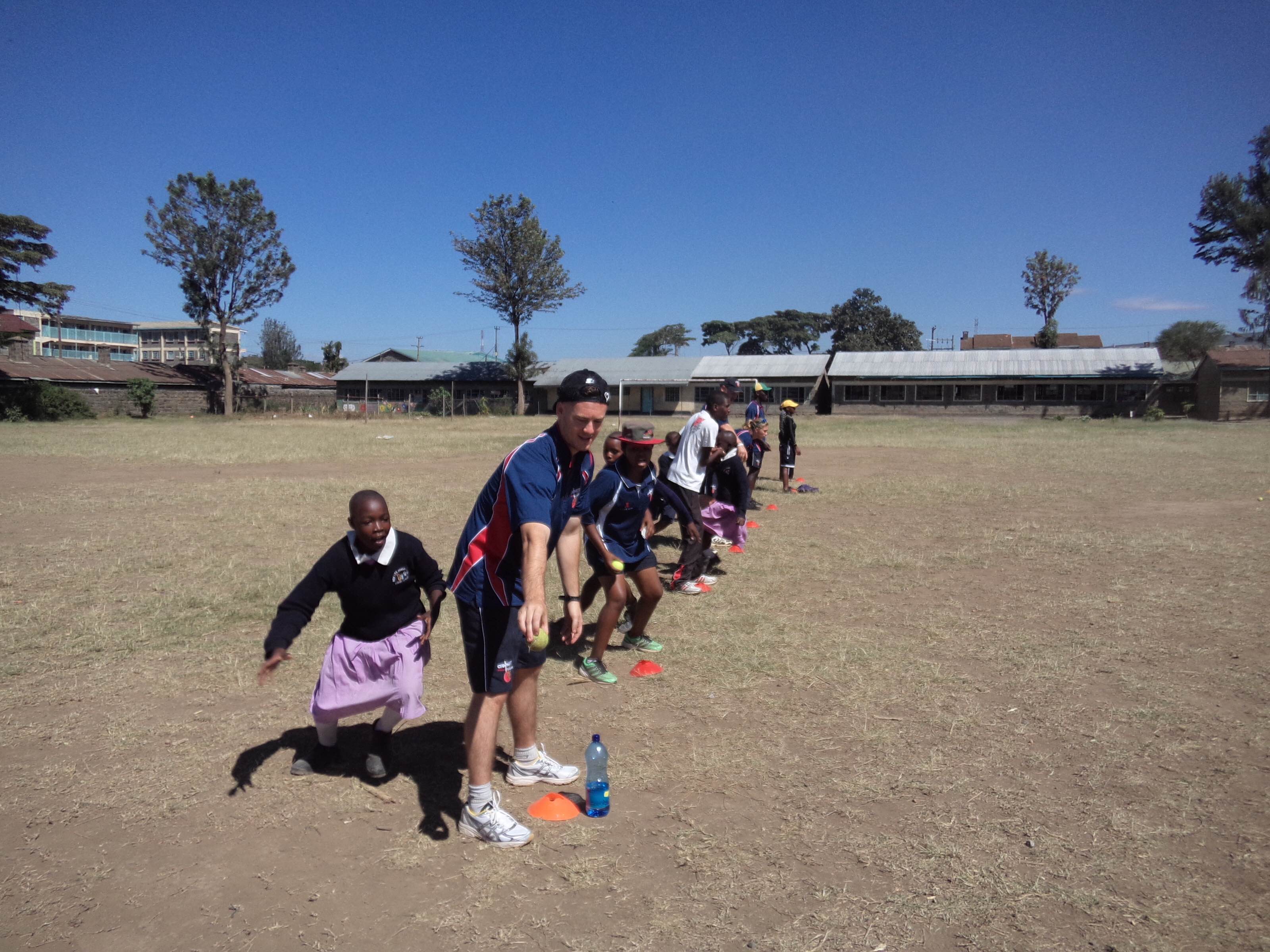 Team captain Gillette Gooding delivered a great opening speech as usual and got the kids up and running with our warm up relay game, before the classes dispersed around the field to the different coaches assigned to coach different skills. I (Sam) was in charge of bowling with a game of cone-strike at the far end of the field, which proved challenging at first as my first group seemed determined to ignore being faithful to the rules and would not abstain from hurling the ball at each other at great speeds. A quick pep talk and extra explanation soon put that right!