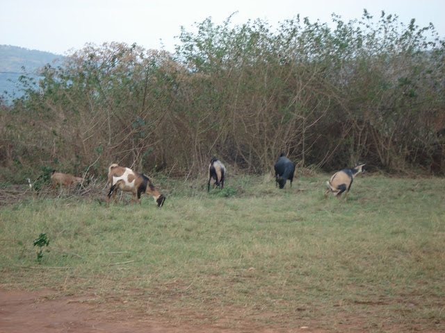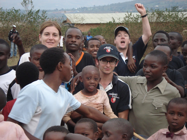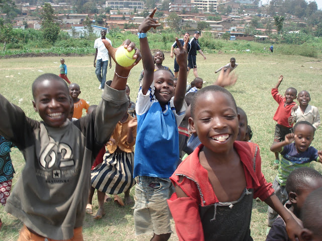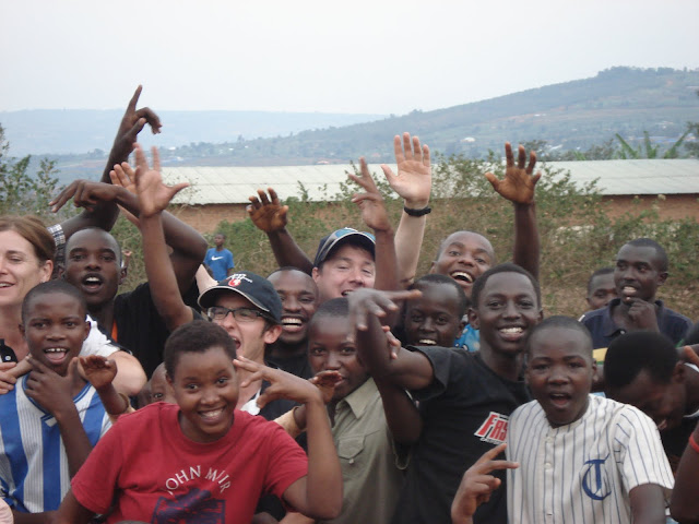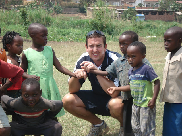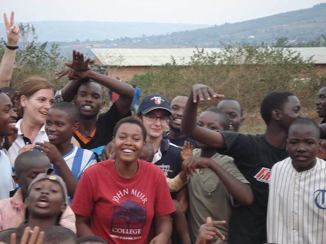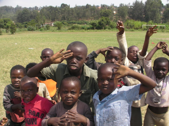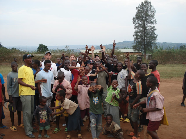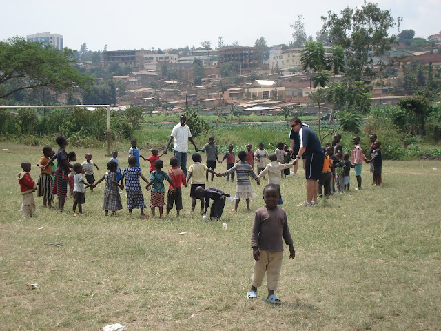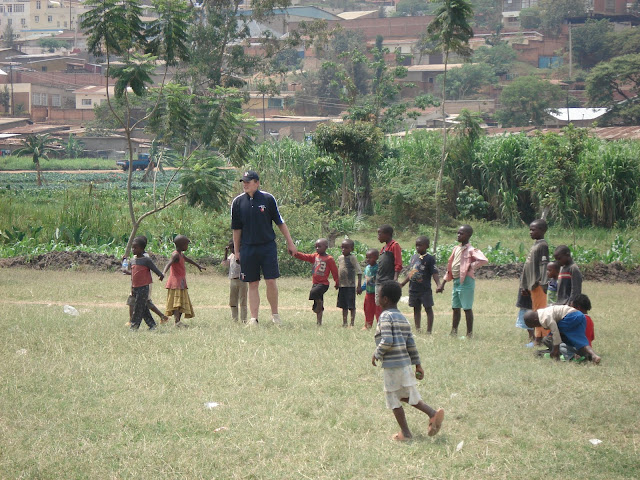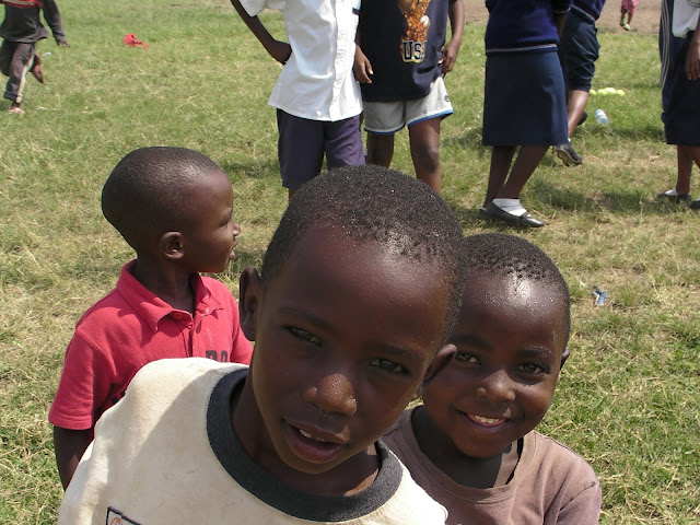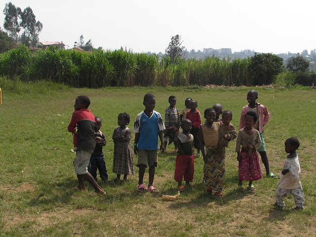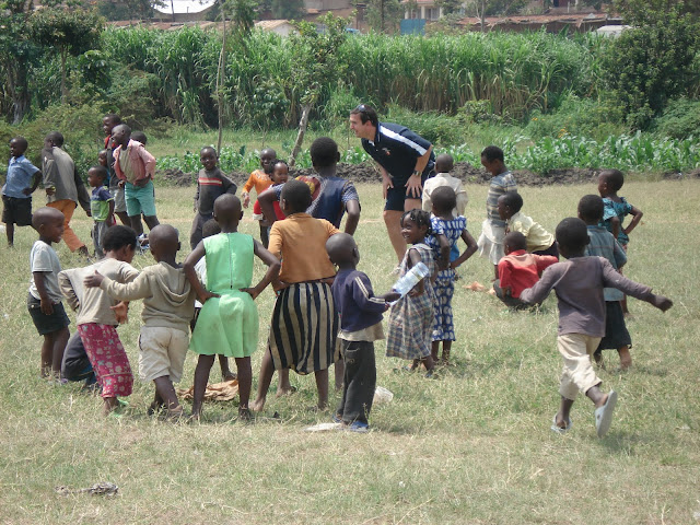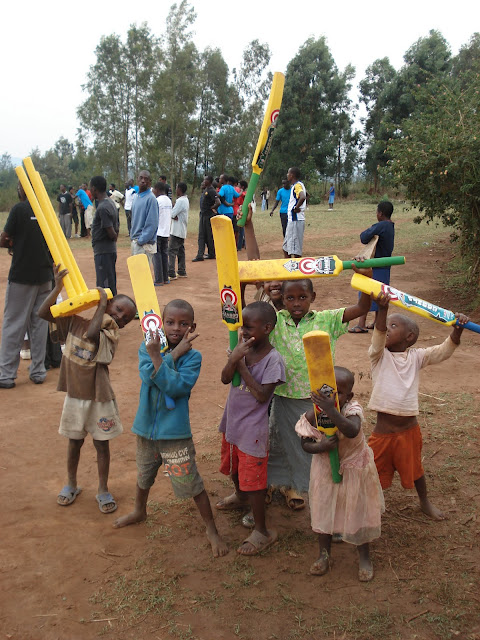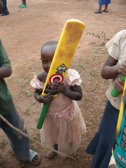 After the previous days problems on the school fields at Apade during break periods we decided to try a flatter patch of ground just down the road so we would be able to concentrate on the class that we were with. This instantly looked a bad idea when as soon as the bus pulled in the grounds we were mobbed by around a hundred young children several of which decided to hang off the rear wind-screen wiper. We started to herd all of these youngsters into a group and Dave to his credit managed to keep them entertained with a few catching games and some singing (Feeling Hot Hot Hot) and some dancing (the crab and the Spanish crab). Eric the Rwanda opening bowler also helped out he is fantastic with the children and we all keep telling him he should be a teacher.