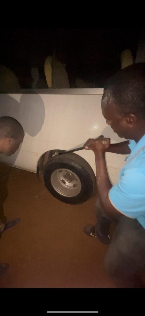 On one of those dusty dirt roads, a massive rock—really more like a boulder—got wedged inside the back left tyre of our bus. For about 30 minutes, our driver Eddie and the team tried everything to dislodge it, but the stubborn rock refused to budge.