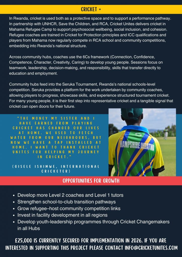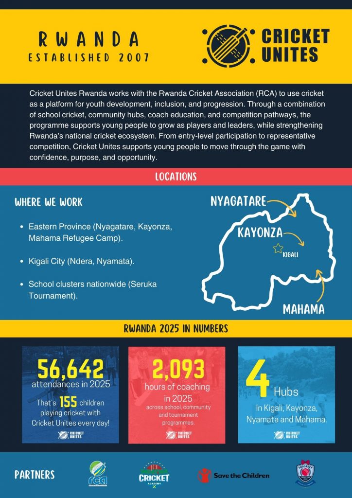 Since 2023, CWB and the MCC Foundation have been joining forces through the global Cricket Unites programme to deliver meaningful cricket-based development alongside local partners in Rwanda.