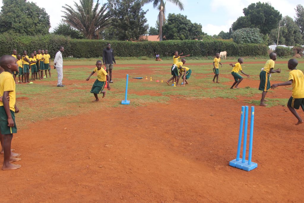Feeling the benefits from the intense work we had put in we returned to the natural high of coaching at the field we had left to the footballers. We were in time to witness a penalty shoot out in full drama. Not wanting to interrupt the equally natal high of the partisan supporters we set up cricket activities away from the action around the edge of the pitch. Catching and basic batting weee introduced to further classes of primary children whose cheers and giggles drowned out the winning penalty – so we still don’t know who won. A committed and inquisitive group of teachers joined us for some basic coach education. This took place behind one of the goals. Fortunately the deciding match on the tournament was pretty one sided so there were no stray shots at our end to put us off our bowling actions. The teachers added highlights to the day by picking up the skills, smiling and making enthusiastic enquiries about the game and how to package it for their children. We finished up with a demonstration game of cricket- which perfectly illustrated the point that there is no one way to play the game.